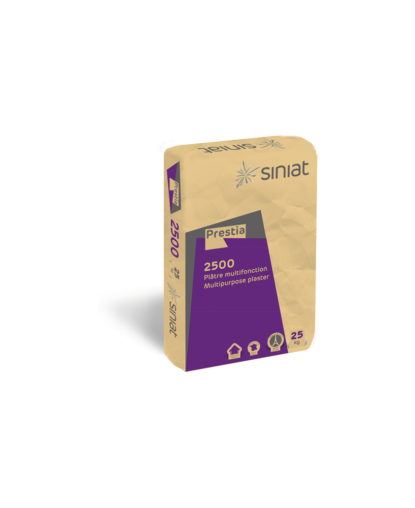 Prestia 2500 is een fijn, zuiver betagips afkomstig uit de streek rond Parijs, speciaal ontwikkeld voor basisformules waarbij een maximale fijnheid niet noodzakelijk is. Prestia 2500 beantwoordt aan de norm gips en gipspleisters voor gebouwen NBN EN 13279-1.